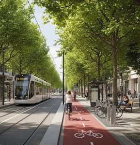 Picture this: A modern tram system gliding quietly along dedicated tracks, offering fast, clean public transport. Beside it, a separated bike lane – safe, wide, and shaded by rows of trees that not only cool the city but invite people to cycle year-round.