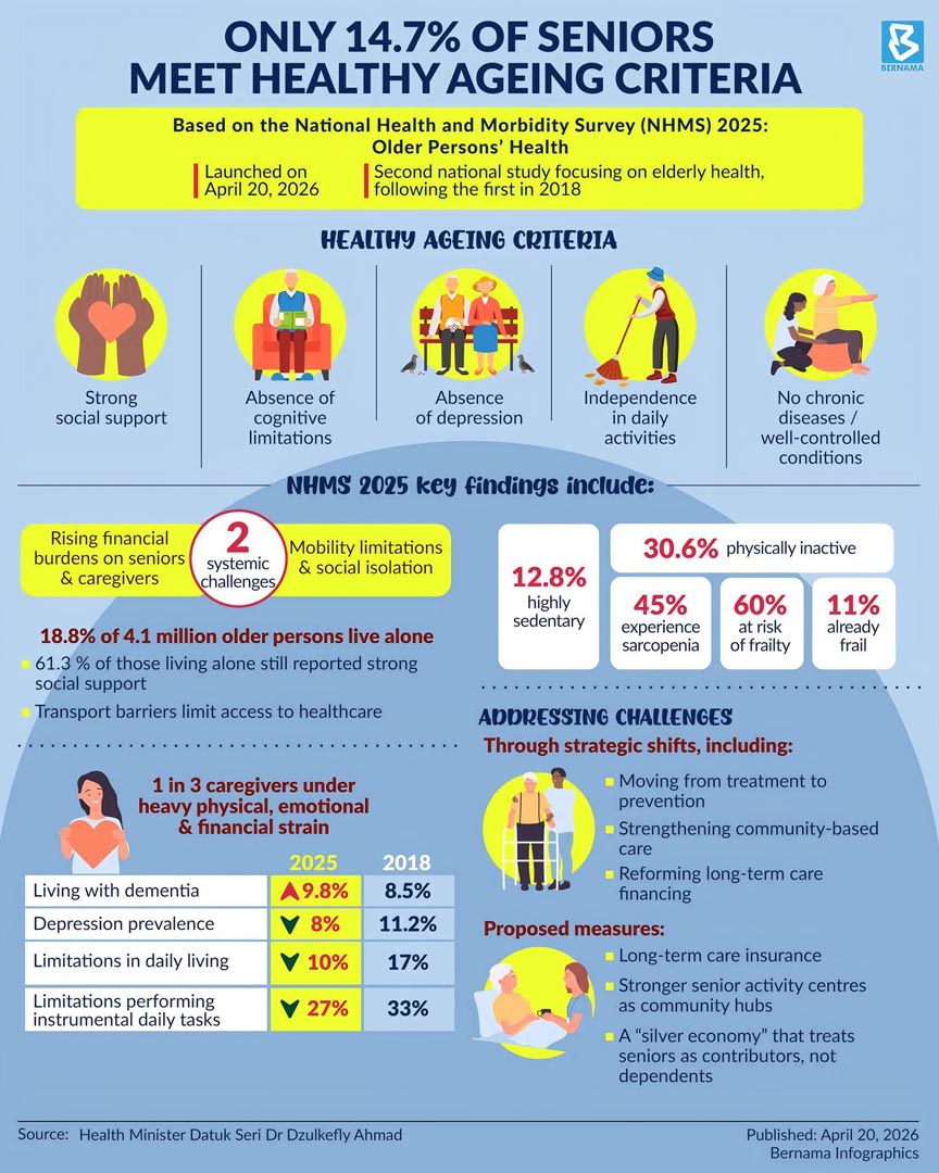 Health Minister Datuk Seri Dr Dzulkefly Ahmad explained that “healthy ageing” is defined by five strict criteria: strong social support, absence of cognitive impairment such as dementia, freedom from depression, independence in daily activities, and either the absence of chronic diseases or well-controlled conditions.
