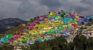 A group of young graffiti artists were asked to paint a Mexican hillside village of 209 houses. The project in the neighbourhood of Las Palmitas in the city of Pachuca was designed to bring its working-class residents together, change the neighbourhood’s negative image, and inspire the local youth.