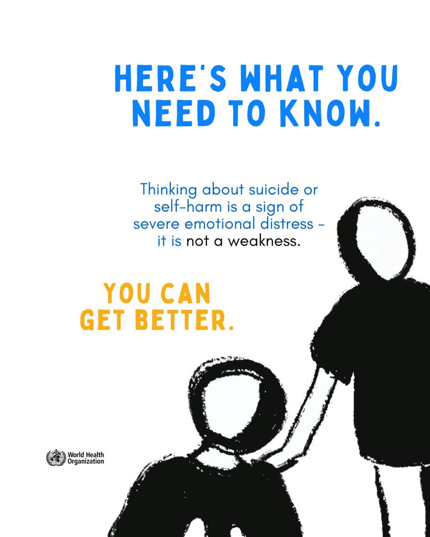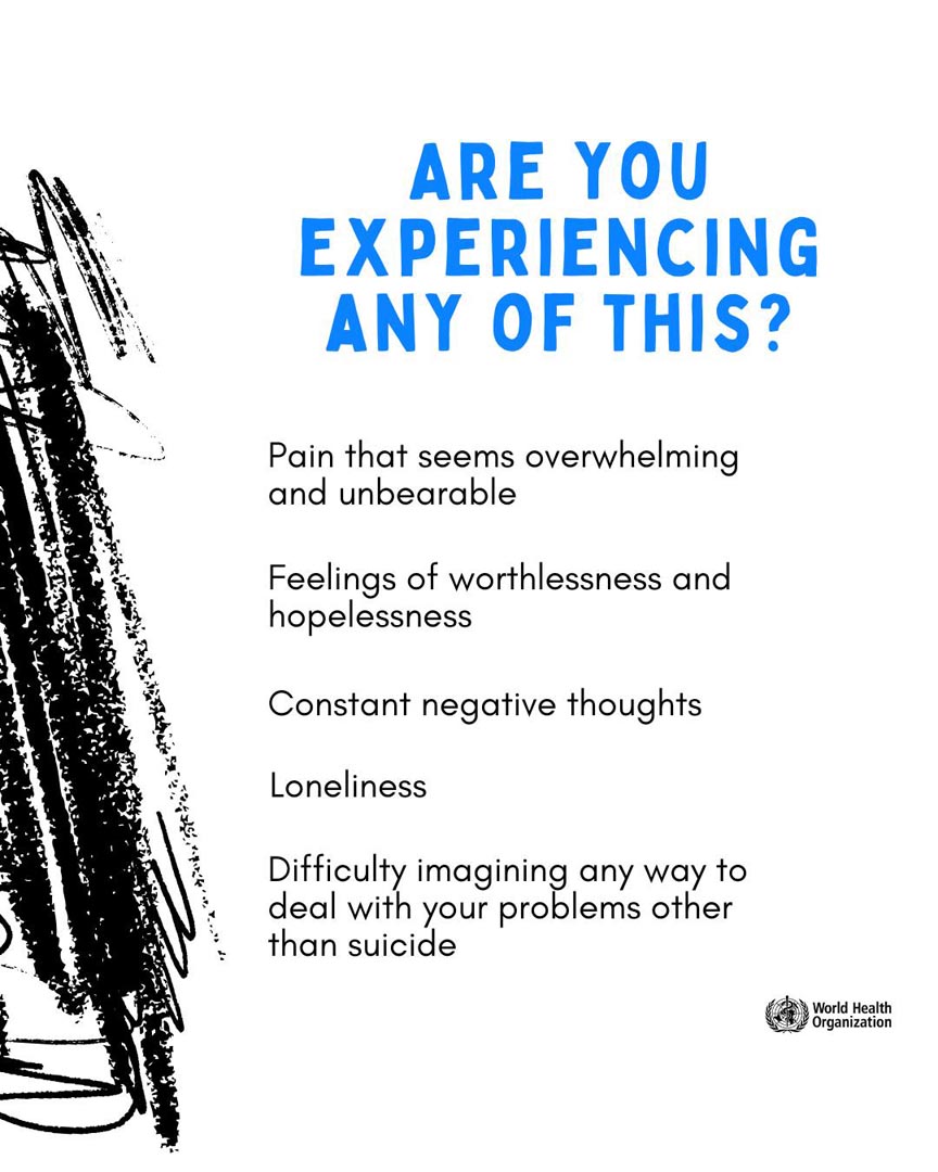 Feeling overwhelmed by pain, worthlessness, or loneliness? You’re not alone. These are signs of severe emotional distress, and help is available. Talk to someone you trust, a health worker, or a crisis line. (WHO)