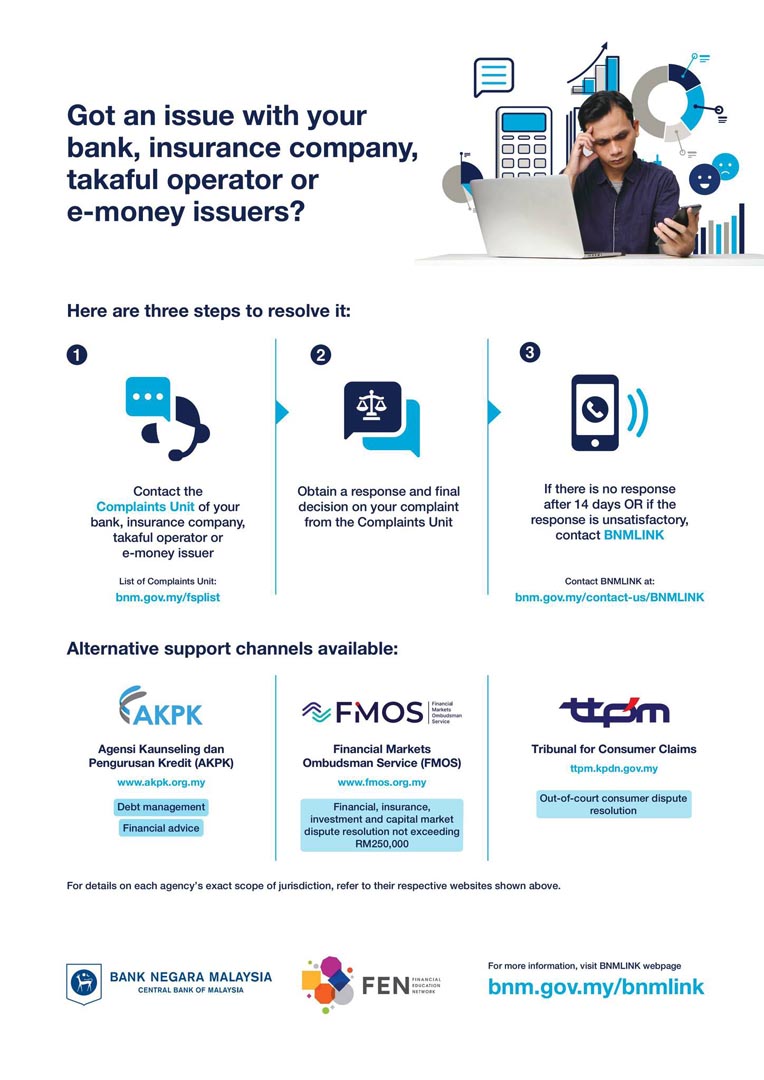 HOW TO RESOLVE UNSATISFACTORY MONEY ISSUES Lai Cheng April 17, 2026 0 Comments Got an issue with your bank, insurance company, takaful operator, or e-money issuers? Check out this advisory from Bank Negara Malaysia.