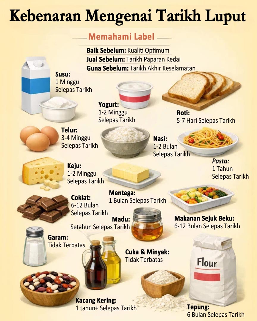 Kebanyakan “tarikh tamat tempoh” adalah mengenai kualiti, bukan keselamatan. Anda mungkin membuang barangan runcit yang masih baik untuk dimakan. Semak panduan ini sebelum membersihkan dapur anda yang seterusnya dan menjimatkan wang sambil mengurangkan sisa makanan. (Maklumat dan ilustrasi: Fb/Coachdebsona)