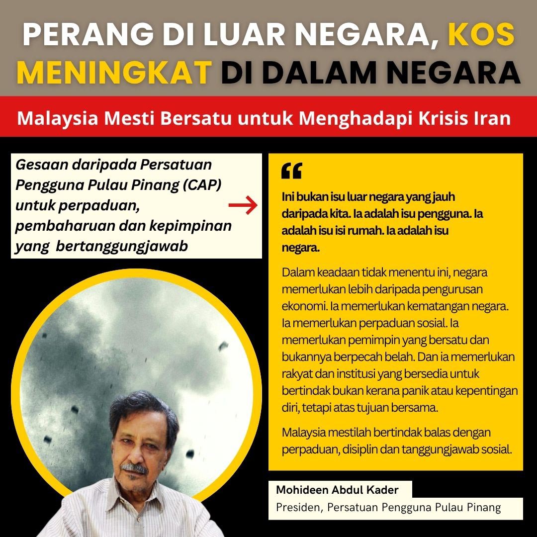 Persatuan Pengguna Pulau Pinang (CAP) menggesa Kementerian Pertanian dan Keterjaminan Makanan (KPKM), jabatan dan agensi berkaitan melakukan perancangan dan bertindak lebih awal bagi menghadapi kemarau pada masa akan datang. Gesaan ini dibuat berikutan kejadian kemarau panjang yang melanda kawasan sawah di Kedah, Perlis dan Perak baru-baru ini menyebabkan berpuluh ribu hektar tanaman padi...