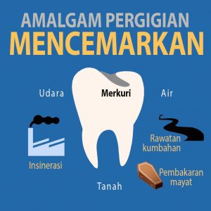 AMALGAM PERGIGIAN mencemarkan air, udara & tanah melalui pelepasan merkuri pergigian daripada pembakaran mayat, rawatan kumbahan & laluan lain.