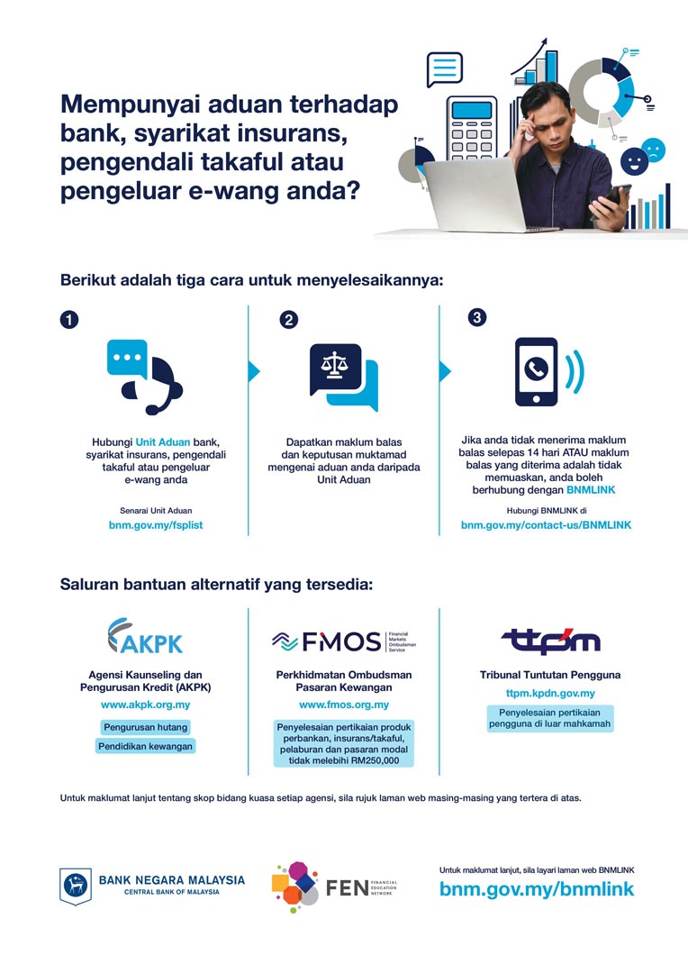 BAGAIMANA MENYELESAIKAN ISU WANG YANG TIDAK MEMUASKAN Lai Cheng April 17, 2026 0 Comments Ada masalah dengan bank, syarikat insurans, pengendali takaful atau pengeluar e-wang anda? Semak nasihat Bank Negara Malaysia ini.