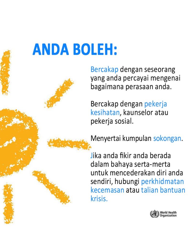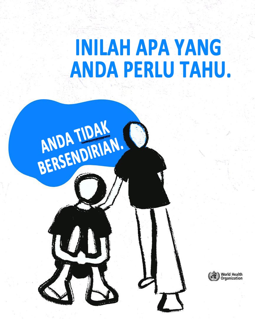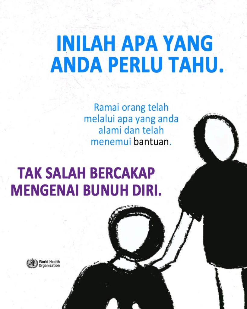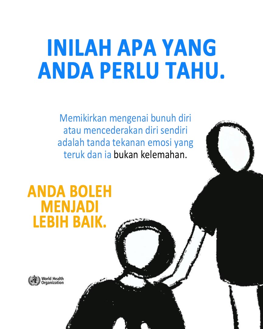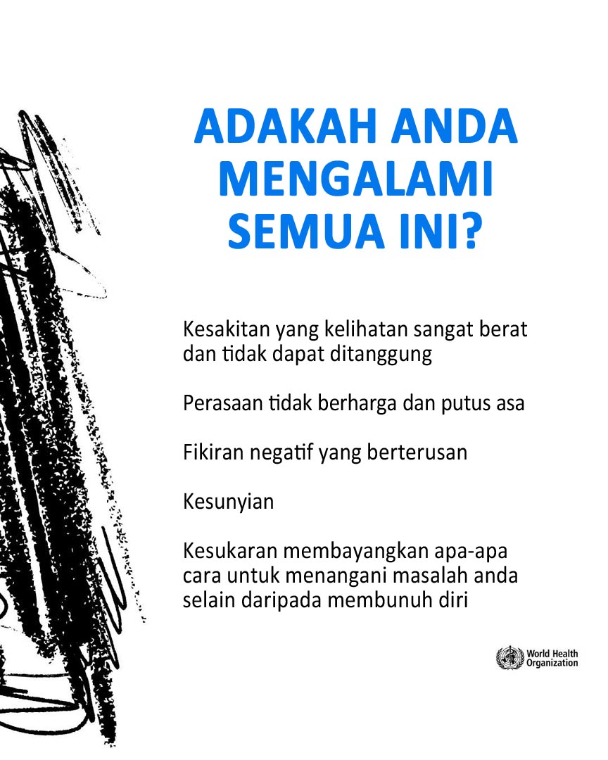 Merasa tertekan oleh kesakitan, tidak berharga, atau kesunyian? Anda tidak bersendirian. Ini adalah tanda-tanda tekanan emosi yang teruk, dan bantuan tersedia. Bercakaplah dengan seseorang yang anda percayai, pekerja kesihatan atau talian bantuan krisis. (WHO)
