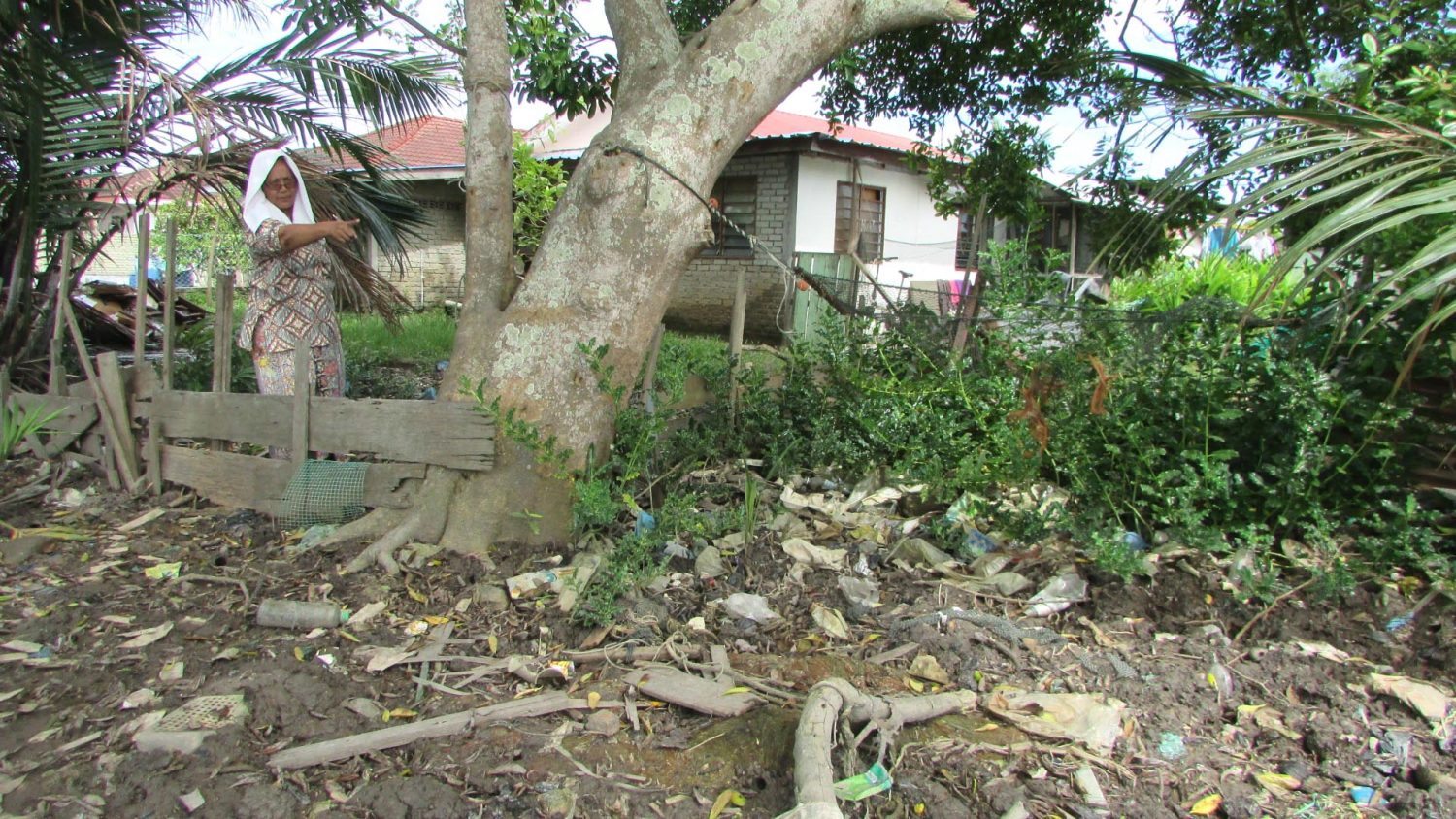 Puan Salimah Mohamad menunjukkan sampah sarap yang terdampar berhampiran rumahnya