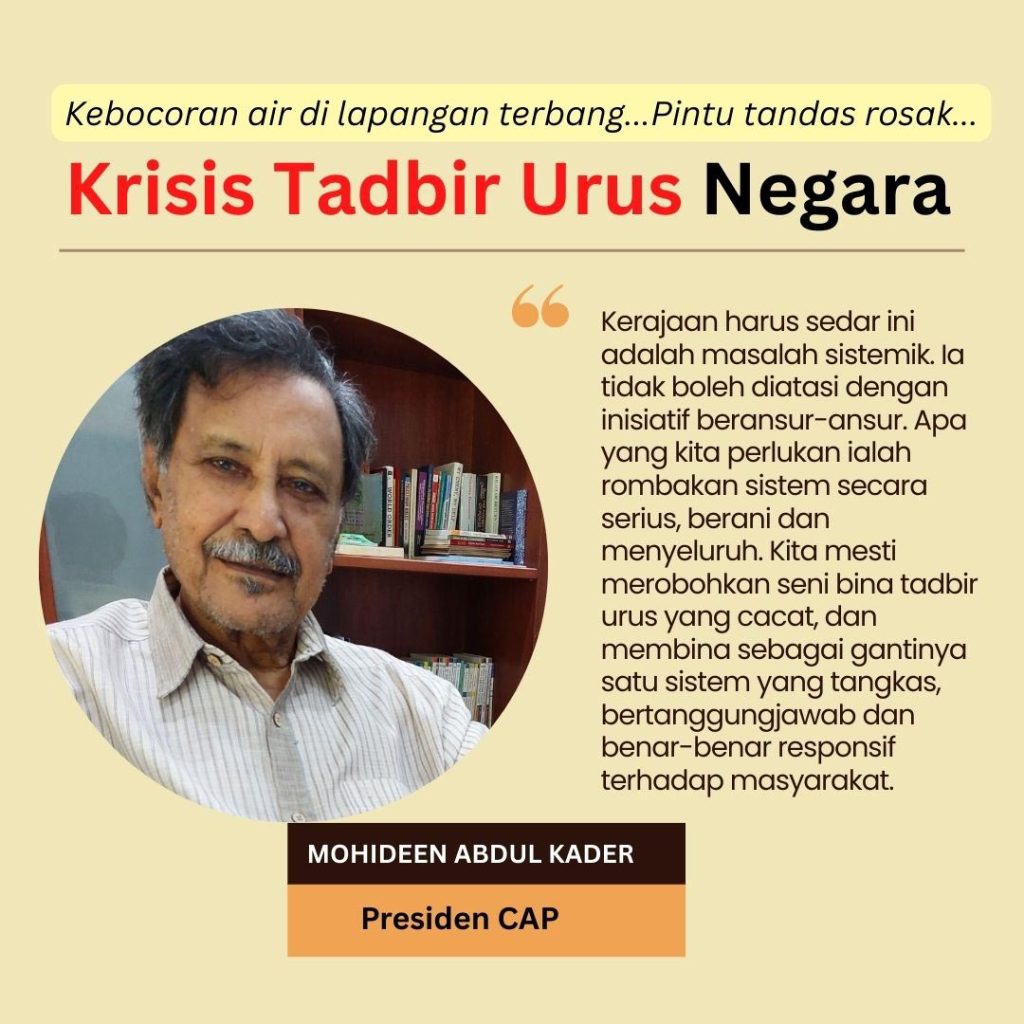 Kerajaan harus sedar ini adalah masalah sistemik. Ia tidak boleh diatasi dengan inisiatif beransur-ansur. Mengubah suai SOP atau mengumumkan jawatankuasa sesekali adalah seperti meletakkan pelekat luka pada luka yang ternganga. Apa yang kita perlukan ialah rombakan sistem secara serius, berani dan menyeluruh. Ini memerlukan membayangkan semula peranan sinergistik sektor awam, sektor swasta dan masyarakat sivil, memperkasakan mereka dengan kejelasan, akauntabiliti, dan tumpuan tunggal pada hasil. Kita mesti merobohkan seni bina tadbir urus yang cacat, dan membina sebagai gantinya satu sistem yang tangkas, bertanggungjawab dan benar-benar responsif terhadap masyarakat. Kebocoran air dari bumbung di lapangan terbang kita telah pulih, tetapi gelombang kekecewaan orang ramai semakin meningkat. Kita mesti bertindak sebelum kita semua tenggelam.