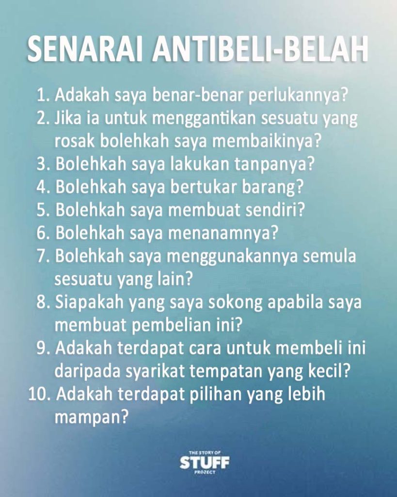 SEBELUM ANDA MEMBELI… Lai Cheng Jun 23, 2025 0 Comments Pergi membeli-belah? Sebelum anda membeli, berhenti sebentar dan tanya diri anda 10 soalan ini. Sumber: The Story of Stuff Project