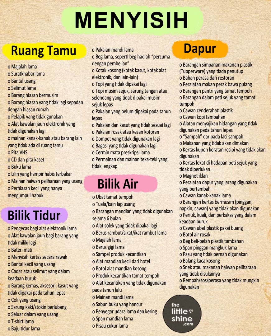 SENARAI SEMAK MENYISIH YANG BERGUNA Lai Cheng Januari 6, 2025 0 Comments Menyisih barangan rumah anda bagi tahun baharu yang lebih kemas? Mempunyai senarai semak membantu. Berikut adalah beberapa perkara untuk dipertimbangkan untuk dibuang. (Gambar melalui Little DIY)