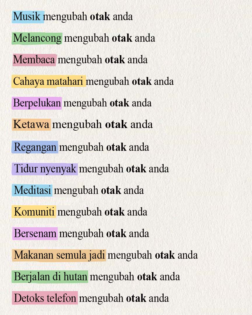 Otak kita sentiasa menyusun semula dan mengubah semula, berdasarkan apa yang kita lakukan, fikirkan dan rasakan. Kebanyakan perubahan semula ini adalah secara tidak sedar, kita hanya menjalani kehidupan kita dan otak kita sedang menghafal dan menyimpan apa sahaja yang kita fikir, rasa atau lakukan berulang kali, kata artikel dalam Happy Brain Life.