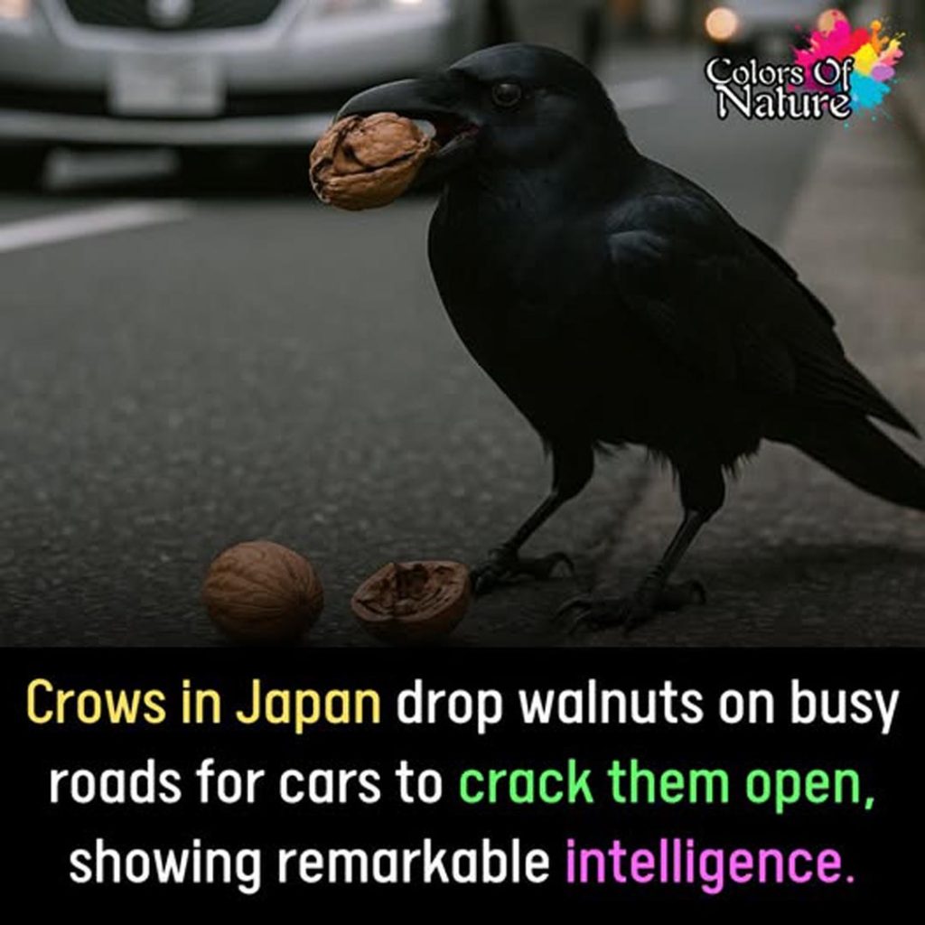 Crows are among the most intelligent birds on earth. In Japan, crows have mastered one of the most ingenious survival tricks ever observed in birds. They deliberately drop walnuts onto busy streets, patiently waiting for cars to do the hard work of cracking them open.