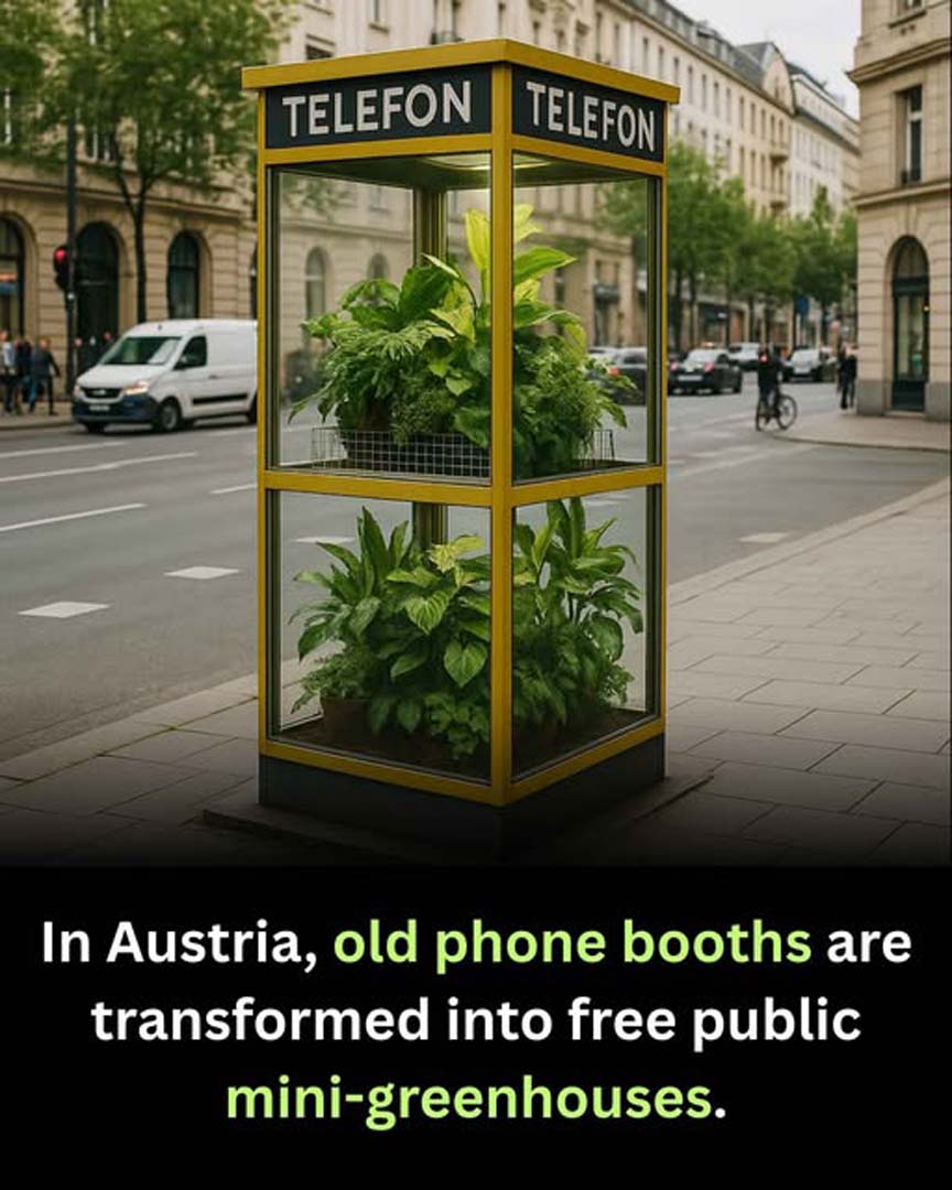 In Austria, creativity and sustainability come together in a charming project that transforms old, unused phone booths into free public mini-greenhouses. Once vital for communication, these booths were left abandoned in the age of mobile phones – but instead of being scrapped, they are now repurposed into small glass gardens filled with herbs, vegetables, and flowers.