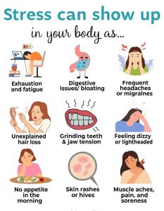 > Your body – headache, muscle tension, chest pain, fatigue, change in sex drive, stomach upset, sleep problems, getting sick easier due to a weaker immune system
