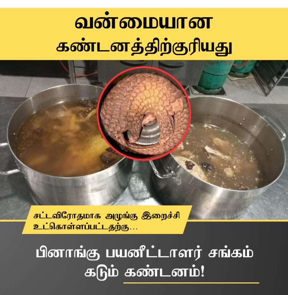 சபா மாநிலம், செம்பூர்ணாவில் உள்ள ஒரு சுற்றுலா விடுதியில் சட்டவிரோதமாக அழுங்கு (Pangolin) இறைச்சி பரிமாறப்பட்ட செய்தி அதிர்ச்சியையும் கோபத்தையும் அளிப்பதாக பினாங்கு நுகர்வோர் சங்கம் தெரிவித்துள்ளது. உலகிலேயே அதிக அளவில் கடத்தப்படும் உயிரினங்களில் ஒன்றாக அழுங்கு உள்ளது. இவற்றின் இறைச்சி மற்றும் செதில்களுக்காக வேட்டையாடப்படுவதால், ஆசியா மற்றும் ஆப்பிரிக்காவில் இந்த இனம் அழியும் நிலைக்குத் தள்ளப்பட்டுள்ளது.