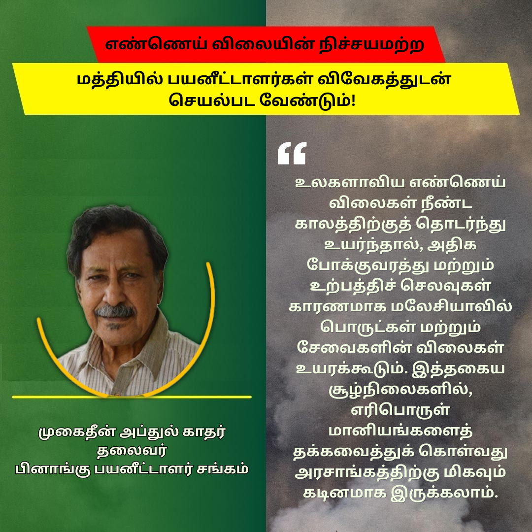 எண்ணெய் விலையின் நிச்சயமற்ற தன்மைக்கு மத்தியில் பயனீட்டாளர்கள் விவேகத்துடன் செயல்பட வேண்டும்! பினாங்கு பயனீட்டாளர் சங்கம் நினைவூட்டல்!