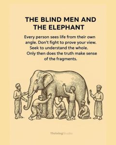 In daily life, we’re often like those blind men – arguing from our limited view, clinging to our small pieces of truth, forgetting that others hold pieces too. In doing so, we forget the larger picture.