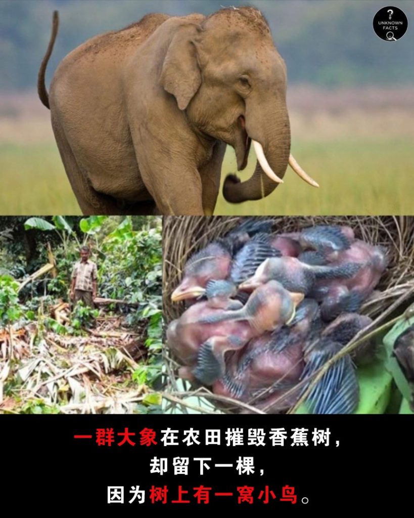 在2021年,印度泰米尔纳德邦有一群大象进入香蕉园摧毁超过300棵香蕉树。有趣的是,有一棵香蕉树毫无损伤,因为树上有一窝小鸟。