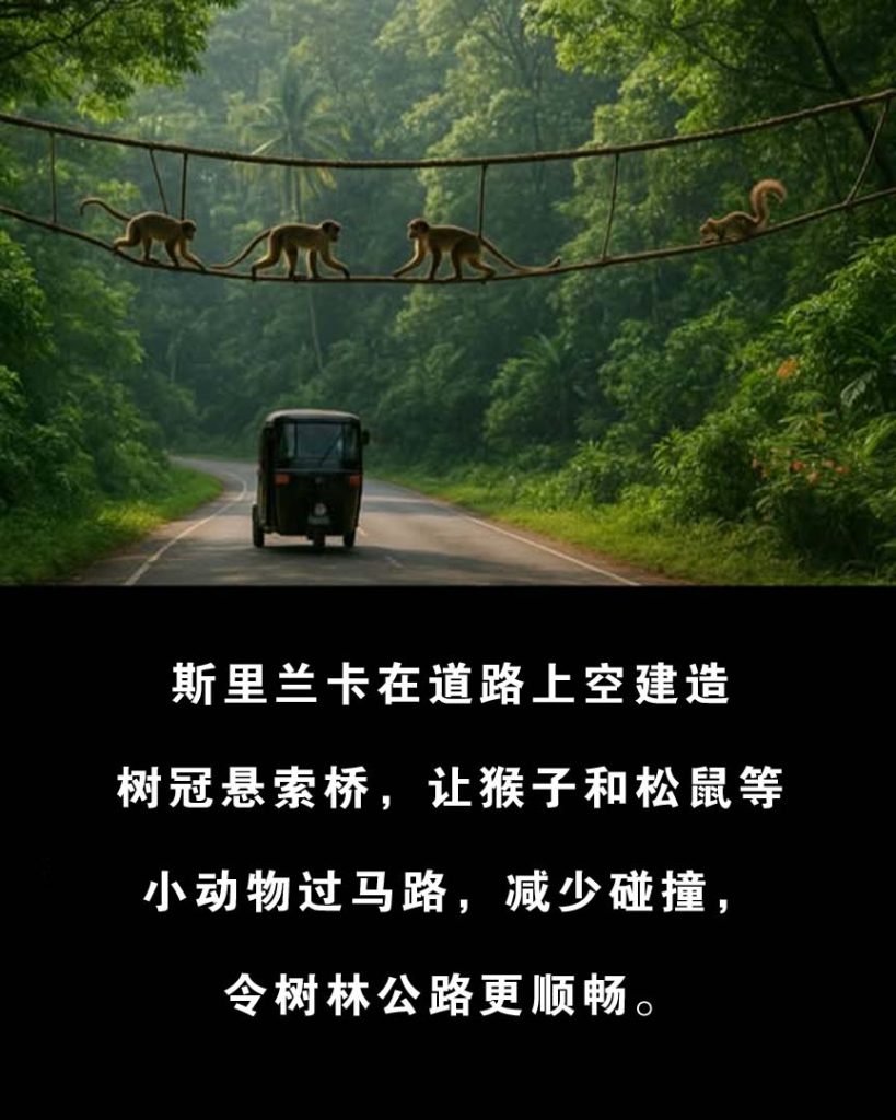 树冠悬索桥 Mei Cheng 8月 15, 2025 0 Comments 保护生活在树木的动物免遭路杀的简单方法。 悬索桥,或猴子桥,穿过公路和高速大道上空,帮助在树上生长的动物过马路。 一些如斯里兰卡等的国家,已建造吊桥让猴子和松鼠安全的过马路,减少路杀和维持道路畅通。 这些在树荫下的吊索,避免了野生动物和车辆碰撞,维持栖息地连贯性,确保动物过桥觅食,毫无危险的寻找配偶和回到各自的属地。 这个简单的方法保护动物之余,也维系生物多样性和生态的复原力。一个小妙招,就让整个生态系统获得保护。 (图片由General knowledge提供)