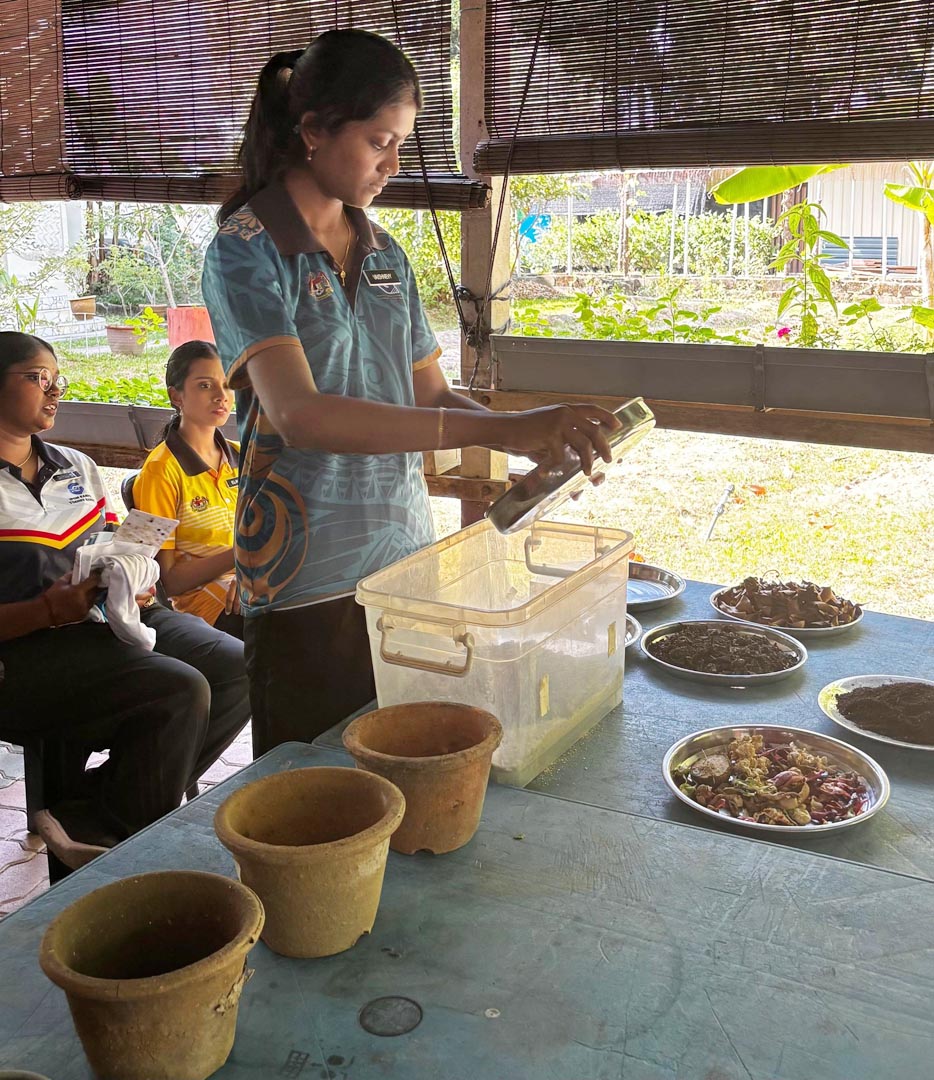 活动接着在槟消协的城市菜园进行,实习教师学习有机堆肥与自然农法。Theeban先生与Saraswathy Devi女士示范简单的家庭堆肥方法,并讲解其益处。实习教师积极参与实践操作。此外,应讲师要求,Theeban先生也简要介绍了有机液体肥料“Panchakavya”及其在可持续农业中的应用。