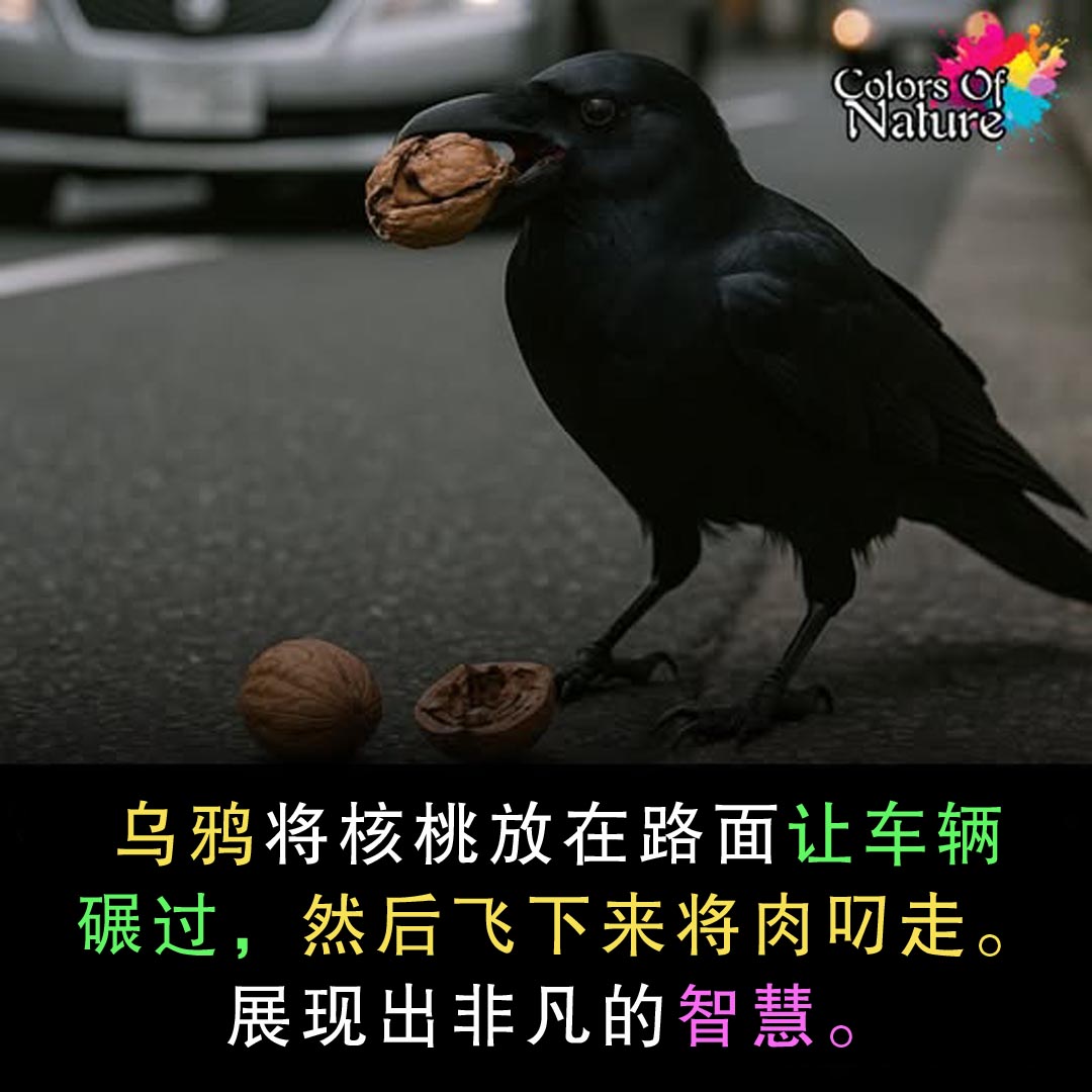 乌鸦是地球上其中一种聪明的鸟类。他们有一种独特的智慧,将无法啄开的核桃放在公路上,当车辆将核桃辗碎,它们就会飞下来将肉叼走。