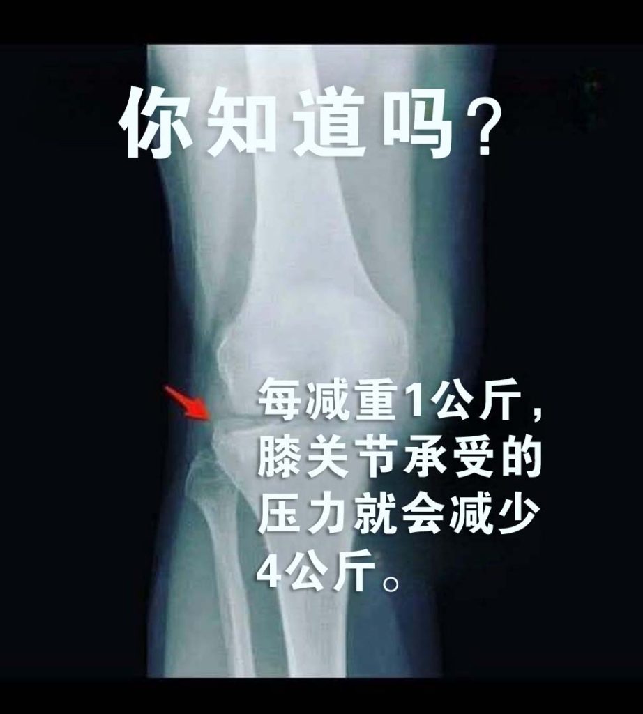 体重过重尤其是膝关节骨性关节炎的一个主要诱因。 你身上每多出一公斤多余体重,就会给你的膝关节增加约 4-5 公斤 的额外压力。