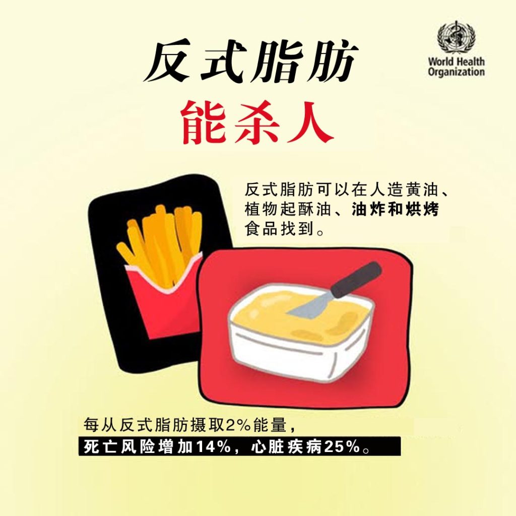 避开食物里的反式脂肪 Mei Cheng 12月 9, 2025 0 Comments 反式脂肪通常可以在人造黄油、植物起酥油、油炸和烘烤食品,以及预先包装好的小食里找到。 世界卫生组织(WTO)最近的研究发现,每从反式脂肪摄取2%能量,可以显著增加以下风险: 心脏疾病25% 死于任何疾病14% 来源:世界卫生组织