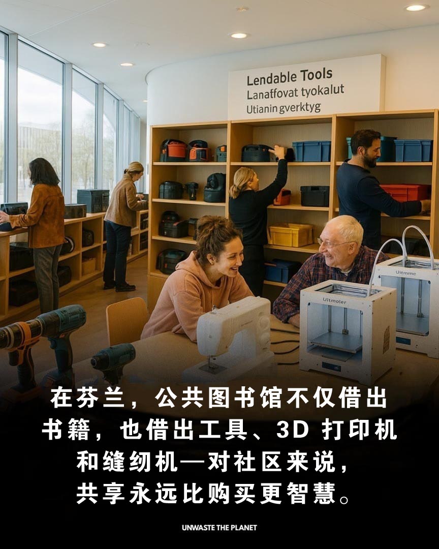 在芬兰,图书馆的角色早已超越书籍本身。他们开始向公众借出缝纫机,鼓励人们修补衣物而不是丢弃。这项小而有力的举措,让低收入家庭无需购买新物品也能维持生活必需品。