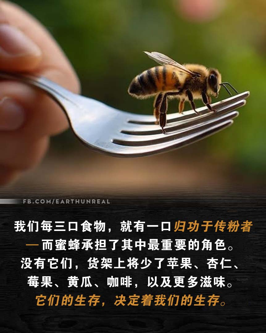 一只蜜蜂停歇在叉子上的画面,正是最好的隐喻:我们的饮食丰盈,系于它们的存亡。