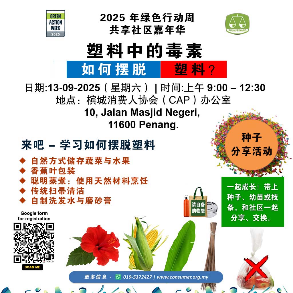槟消协 2025 绿色行动周:如何摆脱塑料? Mei Cheng 9月 11, 2025 0 Comments 绿色行动周(Green Action Week,简称 GAW)是一项全球性运动,旨在推动世界各地的可持续消费。该活动每年于 9 月至 11 月期间举行。参与者通过各类活动展示创意实践,推动资源共享与获取,以促进积极改变。... 阅读更多