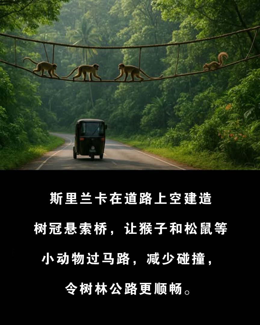 树冠悬索桥 Mei Cheng 8月 15, 2025 0 Comments 保护生活在树木的动物免遭路杀的简单方法。 悬索桥,或猴子桥,穿过公路和高速大道上空,帮助在树上生长的动物过马路。 一些如斯里兰卡等的国家,已建造吊桥让猴子和松鼠安全的过马路,减少路杀和维持道路畅通。... 阅读更多