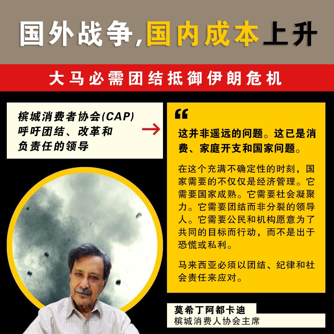 国外战争,国内成本上升:大马必需团结抵御伊朗危机 Mei Cheng 4月 7, 2026 0 Comments 槟消协呼吁团结、改革和负责任的领导 美以伊战争已冲击大马人民的生活。远在中东的战事,引起国内物价暴涨。供应链受到干扰,经济状况不确定。 这已是消费、家庭开支和国家问题。... 阅读更多